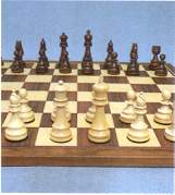 Gedrechseite Figuren aus Ahornholz, aus dem auch die weißen Felder des Schachbrettes bestehen. Ahorn ist ein geschätztes Holz für Drechsler- und Schnitzarbeiten.