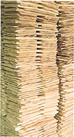 Dabei liegen die Festigkeitswerte noch deutlich unter denen anderer Laubhölzer ähnlicher Rohdichte wie Linde und Erle, dagegen über den Werten von Pappel und Weide . Günstig ist hingegen das Schwindmaß, da Roßkastanienholz nur mäßig schwindet. Ebenso "arbeitet" es nur wenig, so daß es sich nach der Trocknung durch ein gutes Stehvermögen auszeichnet. Da das Holz gegen holzzerstörende Pilze anfällig ist, besitzt es unter Witterungseinfluß eine nur geringe natürliche Dauerhaftigkeit. Bild oben: Furnierstapel aus Roßkastanie für die Herstellung von Spankörben. Im Kontakt mit dem Erdboden ist es ungeschützt kaum länger als 2 bis 3 Jahre haltbar. Die Trockriung bereitet im allgemeinen keine Probleme, da Roßkastanienholz nicht nennenswert zum Reißen und Werfen neigt. Zu berücksichtigen ist jedoch, daß es leicht verstockt, vergraut und anderweitig empfindlich gegen Verfärbungen ist, so daß sowohl das Rundholz als auch das Schnittholz einer sorgfältigen Pflege bedürfen. Hierzu gehören ein rascher Einschnitt sowie die Lagerung der Schnittware in luftigen Stapeln, gegebenenfalls unter Vortrocknung in senkrechter Lagerung. Bei der technischen Trocknung sollten die Anfangstemperaturen 60 G nicht übersteigen.